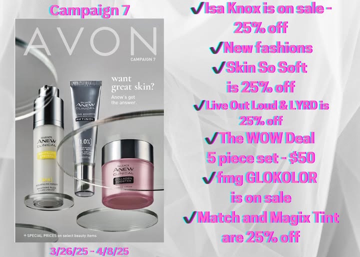 Don’t miss out on these skincare must-haves and exclusive special offers on beauty products! The Campaign 7 Avon brochure is available now, and it’s packed with limited-time deals, trending skincare essentials, and customer-favorite beauty products.